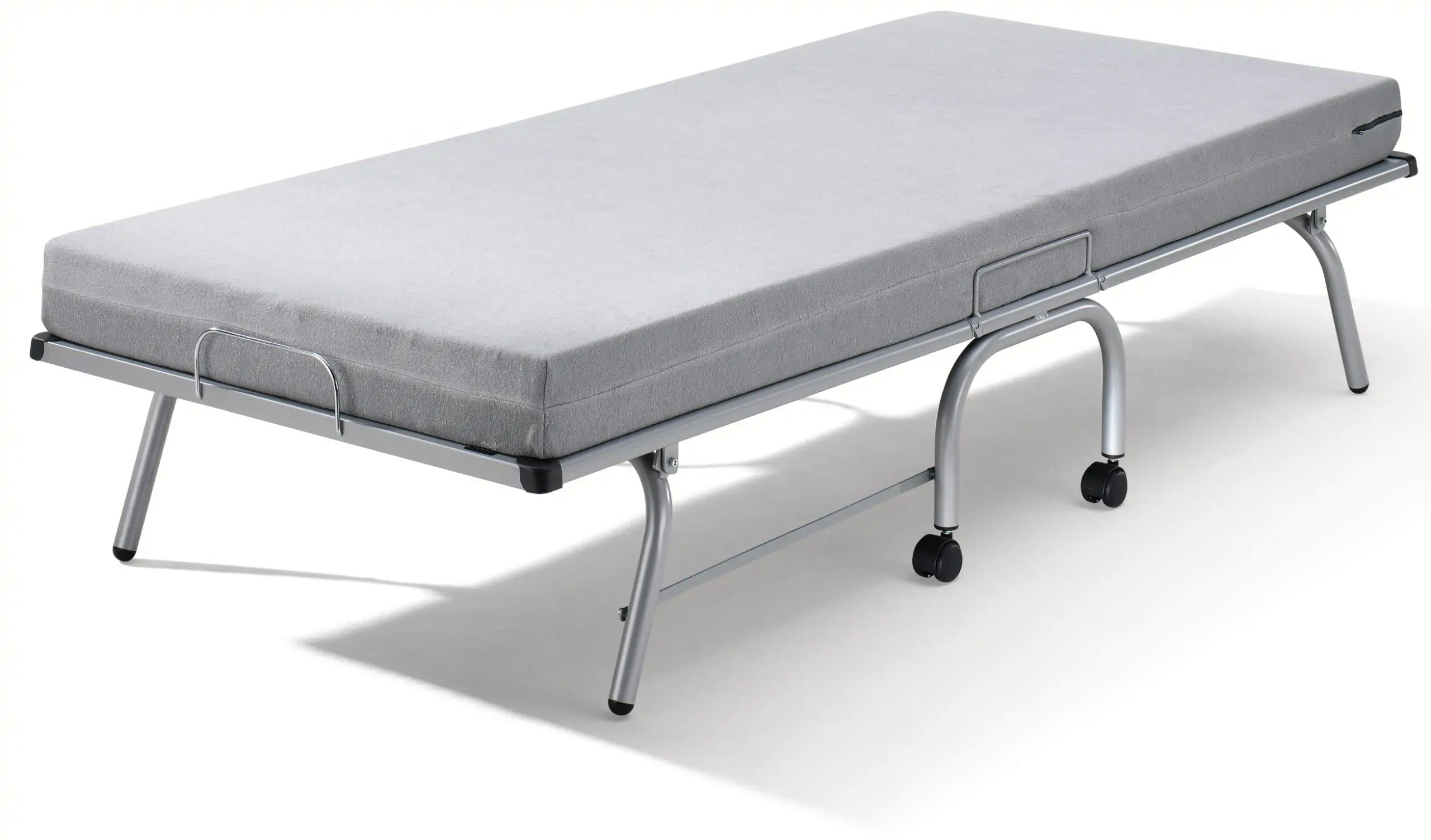 • Lit pliant robuste avec matelas inclus• Équipé de roues et de pieds à déploiement automatique