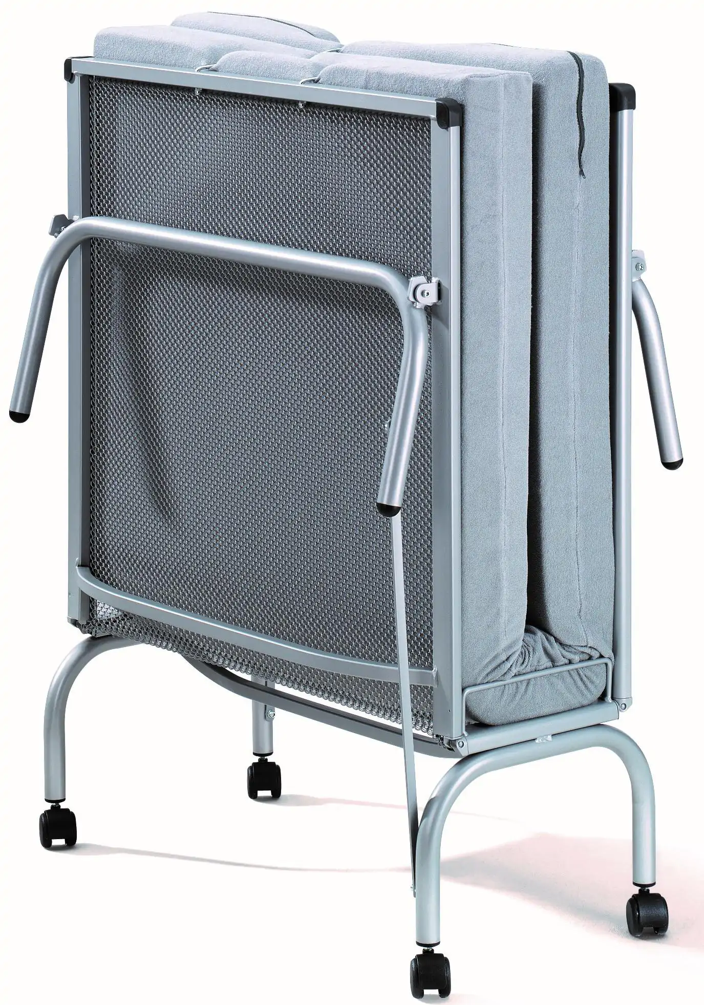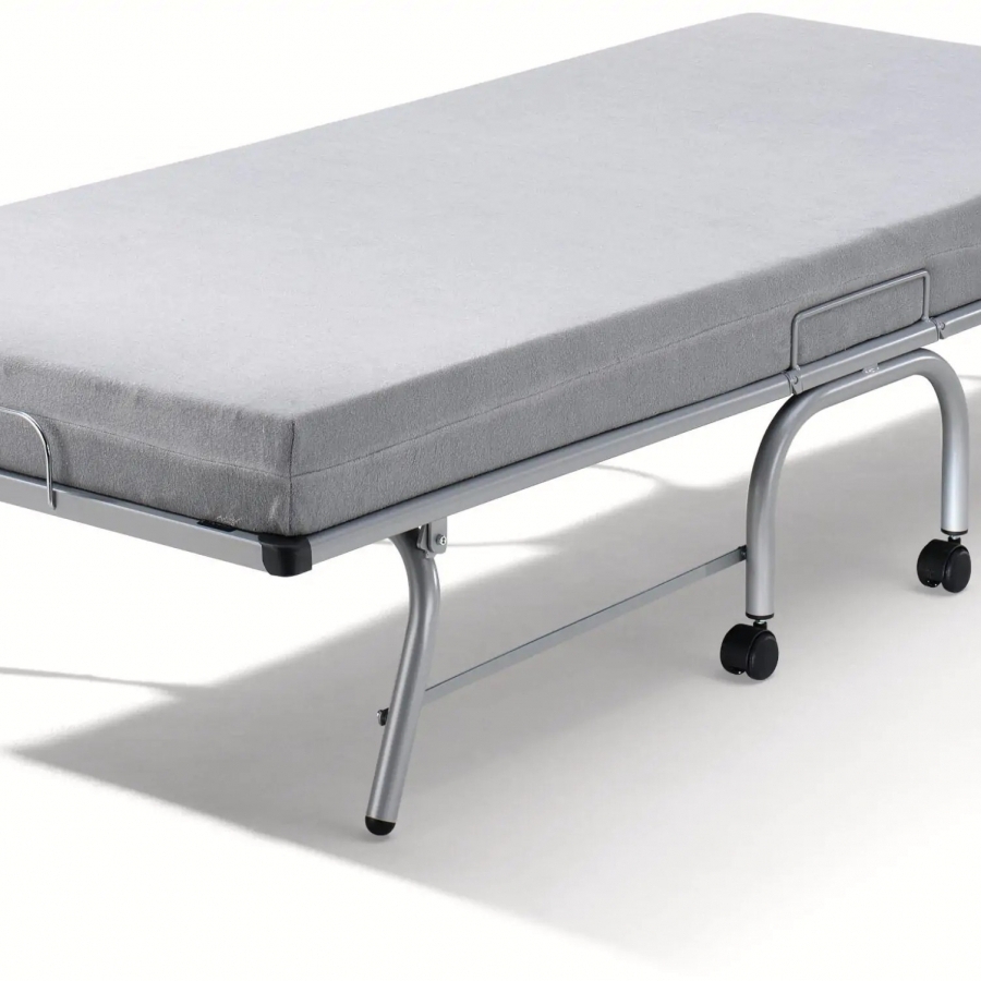 • Lit pliant robuste avec matelas inclus• Équipé de roues et de pieds à déploiement automatique